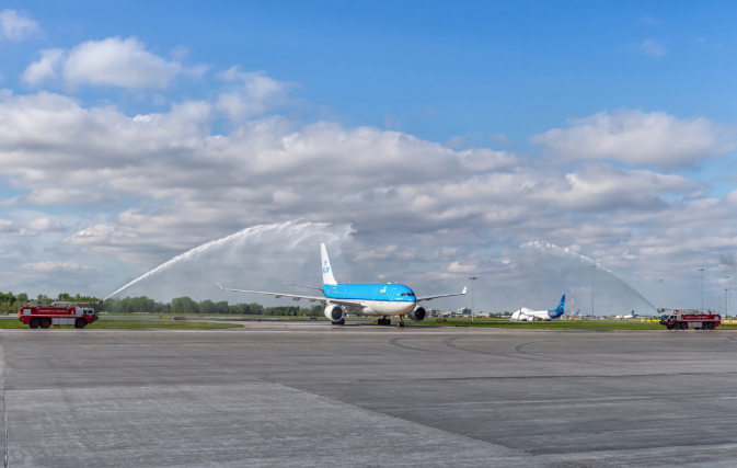 MONTREAL — Today marks the 70th anniversary of KLM’s inaugural flight between the Netherlands and Canada, a milestone occasion that the carrier marked with an official water salute by firefighters at Montréal-Trudeau airport.