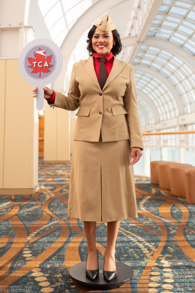 Representing Trans-Canada Airline (TCA), as Air Canada was known when it was founded in 1937, Kerem opened the show with the company’s original flight attendant uniform. “I truly love how fashionable, comfortable and professional it feels,” Kerem said. Calling it an honour to wear, Kerem described the look as feminine, elegant and beautifully detailed. Though stylish, this first version lasted only a few months before being replaced with a grey summer design and a blue winter version that remained until 1949.