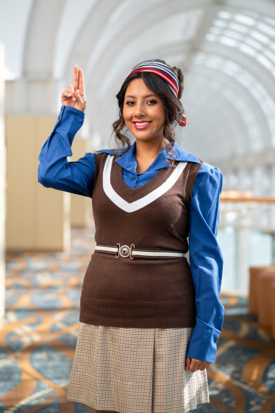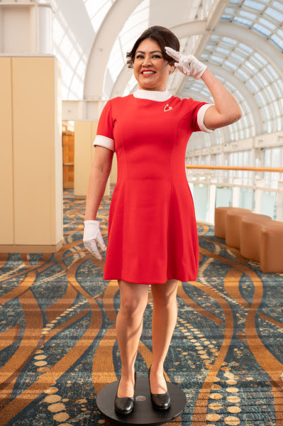 Vanessa represented the next phase, a versatile line that gave employees more than 50 pieces to mix and match. Her uniform included jackets, skirts, pants, sweaters and blouses, complemented by accessories like scarves, belts, berets, umbrellas and even a rainhat! “Walking the runway in such an iconic uniform was definitely the highlight,” Vanessa said, adding that she felt proud to showcase such an integral part of Air Canada’s history.