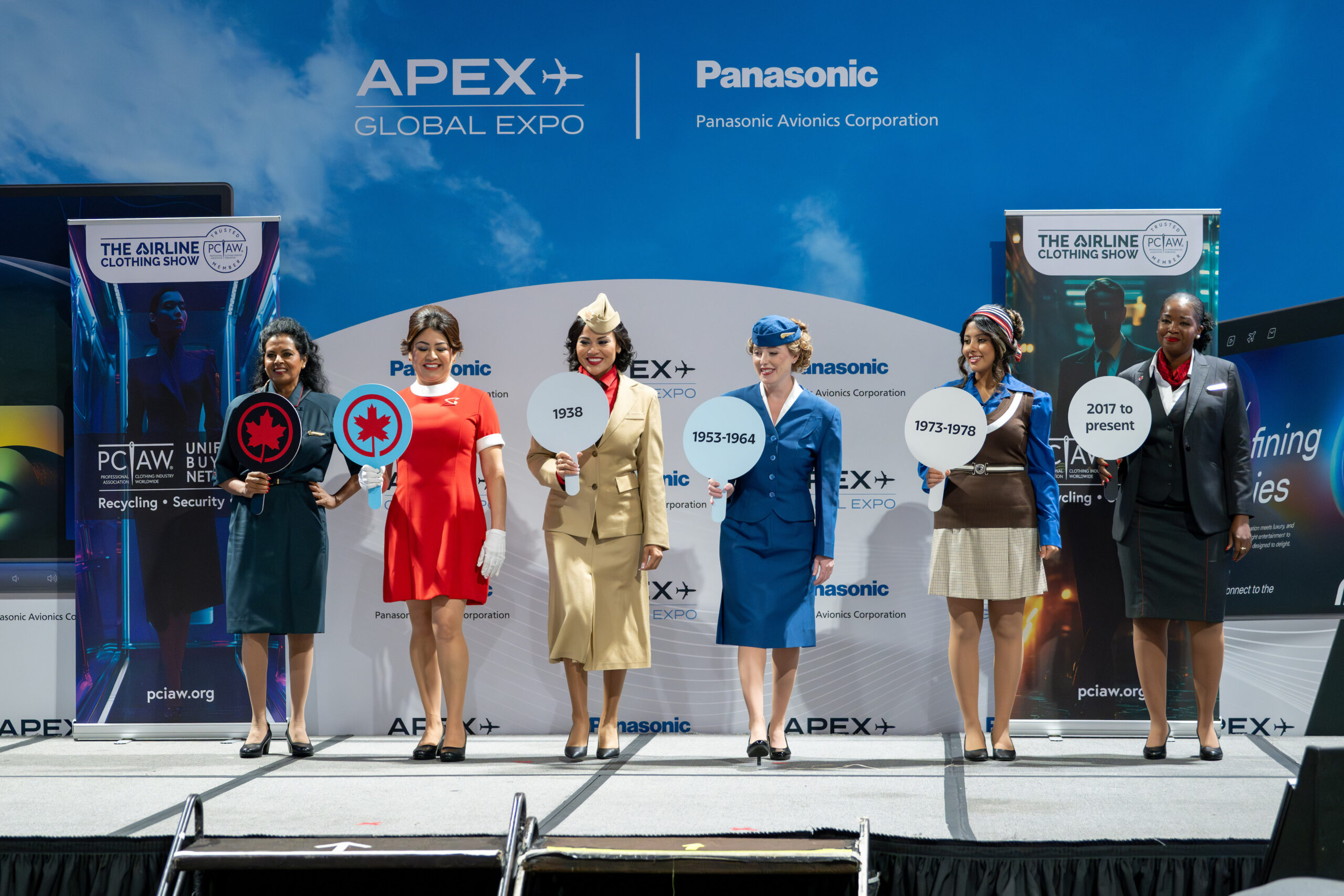 While at the PCIAW (Professional Clothing Industry Association Worldwide) Fashion Show at the APEX/IFSA Global EXPO 2025 in Long Beach, a team of Air Canada’s Los Angeles-based employees and Montreal-based flight attendants modelled six different looks, each reflecting various eras in the airline’s history.