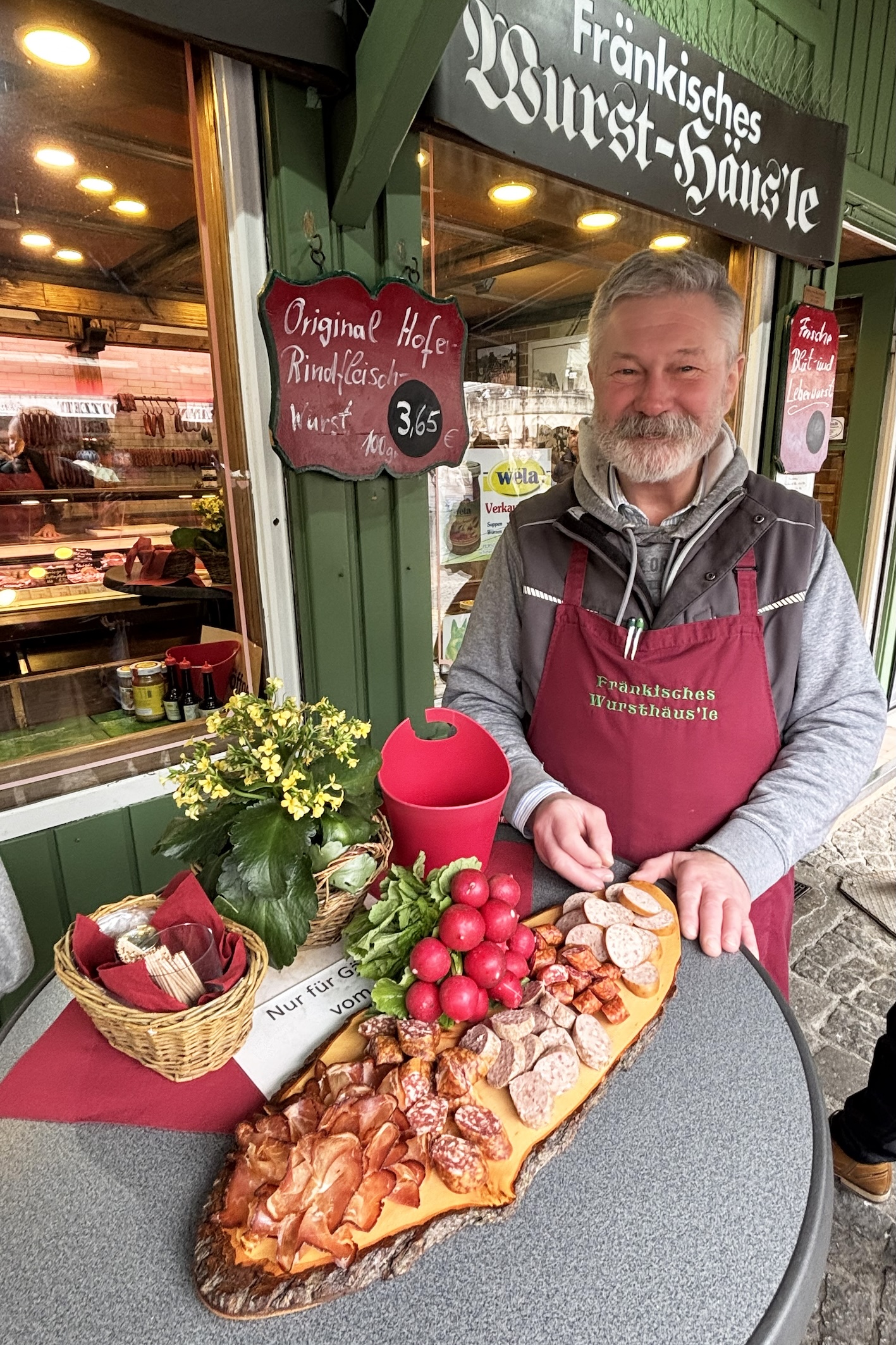 - Vendors sell traditional produce including meats and cheeses at the Viktualienmarkt