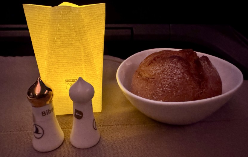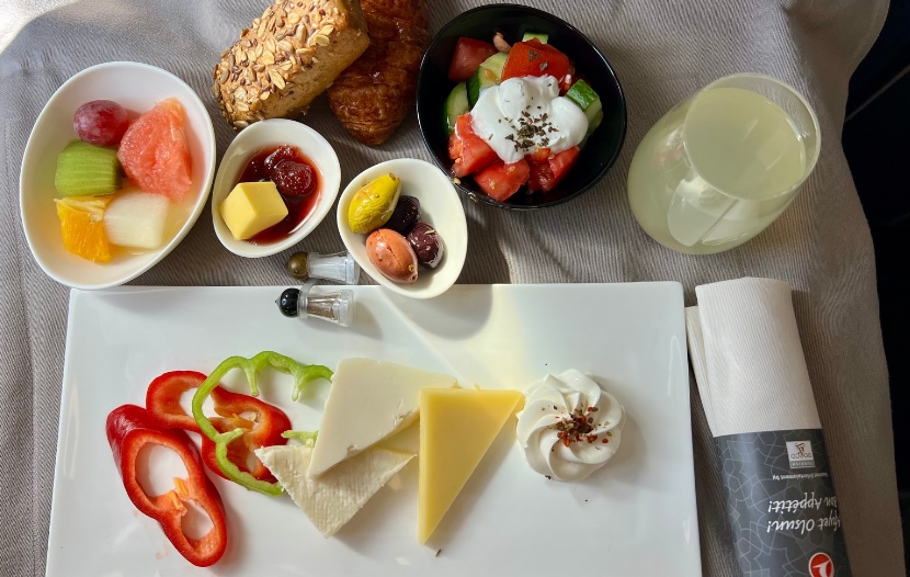 Then comes the main course; over four flights, every option was enticing: beef tenderloin in rosemary jus, salmon fillet with celeriac mousseline, grilled lemon chicken, tagliatelle with burrata, Cape hake fillet (a South African fish) with sautéed spinach, lobster linguine, kuru fasulye (a traditional Turkish bean dish in tomato sauce)… before breakfast is served prior to landing.