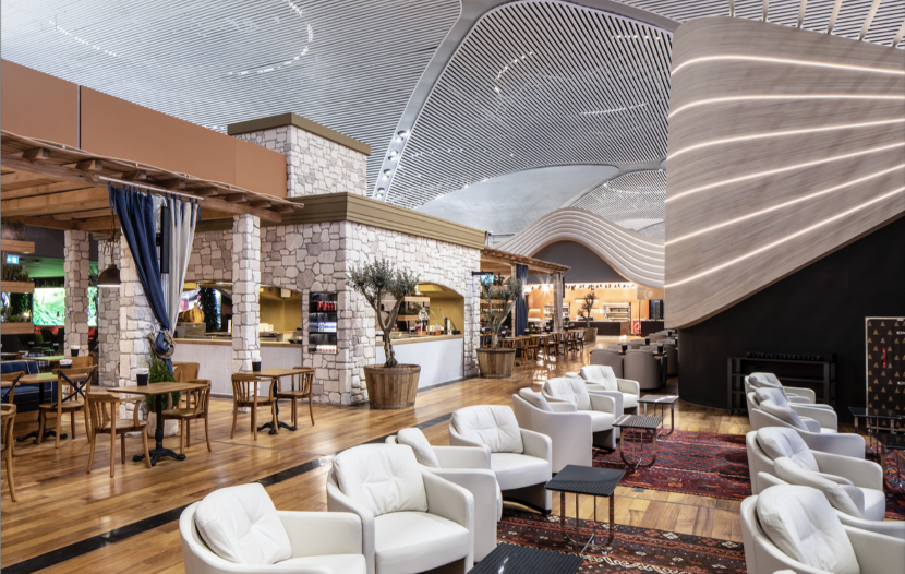 Next, whether you’ve quickly cleared security or are in transit, you gain access to an immense Business Lounge. Located in front of Gate E1, on a mezzanine overlooking one of the airport’s large wings, it impresses upon arrival with its giant screen and stunning, chic, airy design.