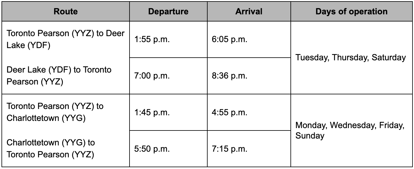 Seasonal service between Toronto Pearson and Deer Lake runs June 10 – Sept. 13, with three weekly roundtrips, while Toronto Pearson-Charlottetown goes June 13 – Sept. 14, with four weekly roundtrips, all on Porter’s E195-E2 aircraft.