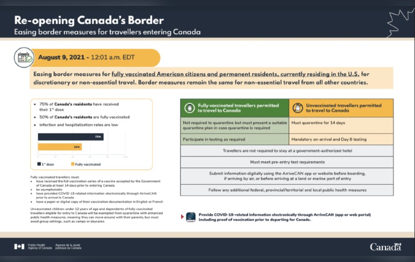 The eased restrictions will apply to fully vaccinated American travellers several weeks earlier, on Aug. 9, 2021, as a gradual first step to the border reopening ramp-up, and will include discretionary travel as well. The move is in recognition of “the many close ties between Canadians and Americans,” said the federal government in its border update.