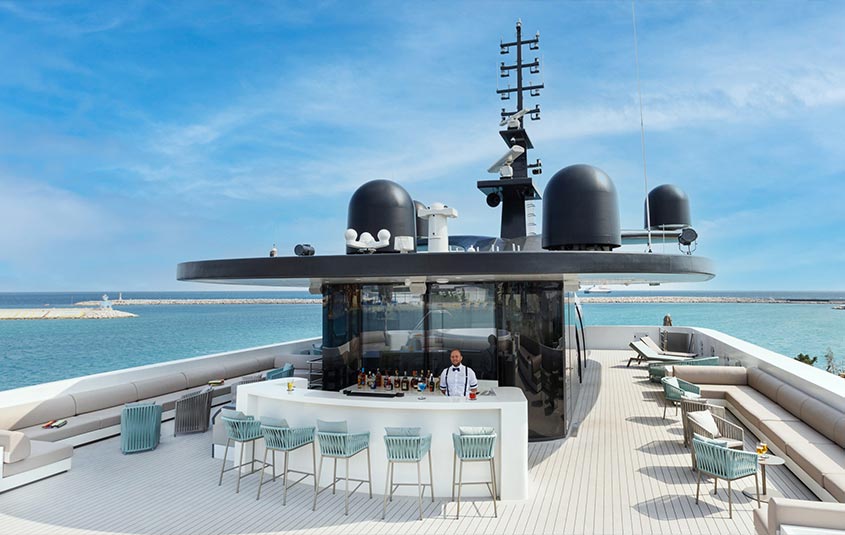 Other highlights onboard include TechnoGym equipment, an infrared sauna – a first for a yacht of its size – and a marina platform that provides guests with easy access to water sports and activities, including the use of SEABOBs and the very latest in electric bikes from Gocycle.