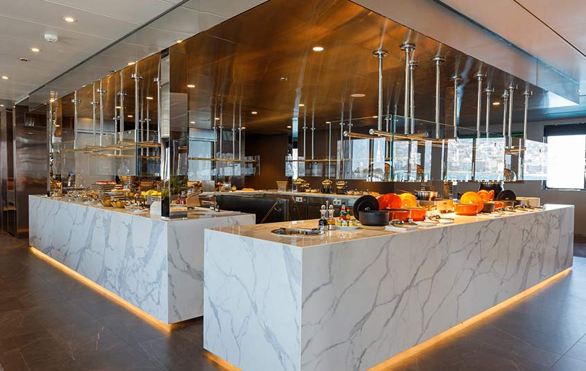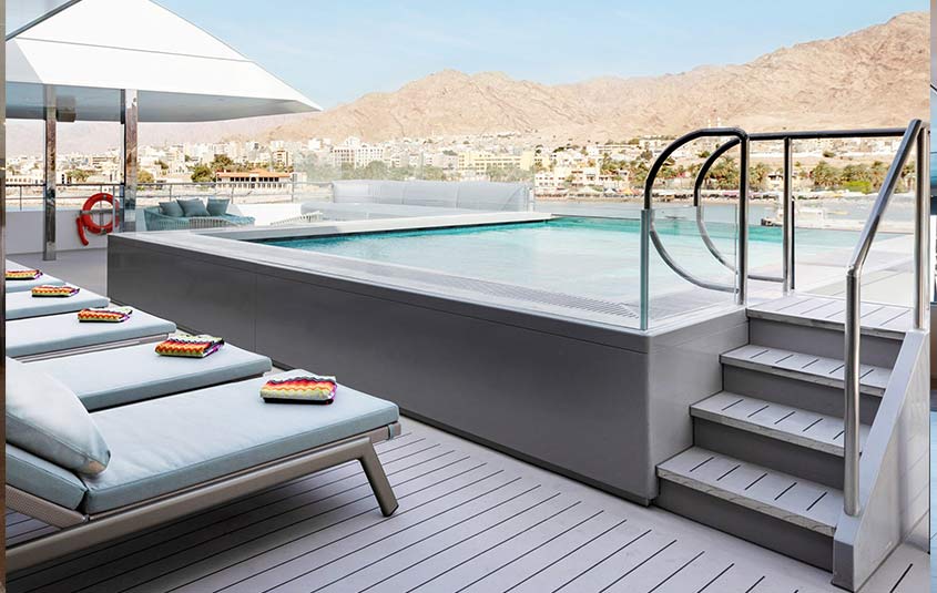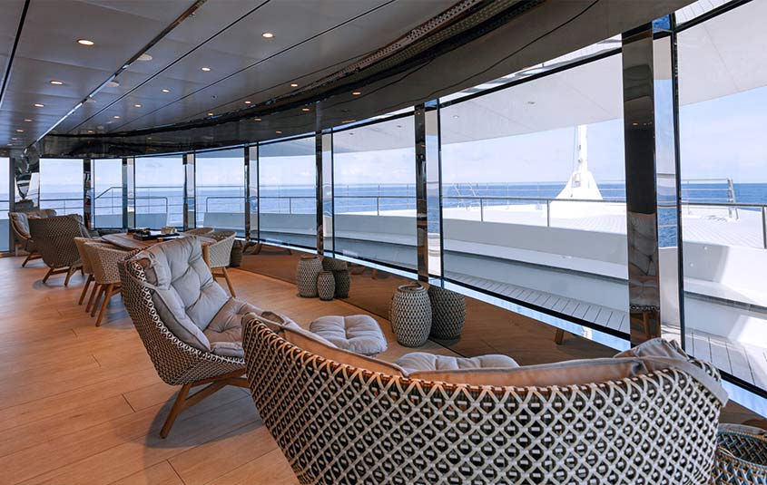 The 100-guest yacht features designer furnishings throughout and a stylish pool deck that has proven a popular spot for guests. Outfitted with Paola Lenti day loungers and Kettal lounge chairs in cool tones that complement the infinity-style pool. This space also features a café serving healthy breakfast items and a selection of flatbreads at lunch. Indoors, the stylishly appointed Observation Lounge includes a Dedon MBrace Wing Chair and footstool as well as sleek L’Object games such as chess and tic tac toe for guests to enjoy.