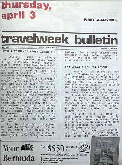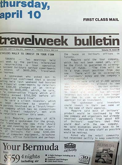 A second follow-up story on April 10 told how unnamed members of the trade had garnered commitments of $600,000 to salvage what they could of Unitours’ operations. “The retail community has had enough of bankruptcies … Agents liked the quality of product Unitours offered and they don’t want that product dispersed to other tour operators,” said one.