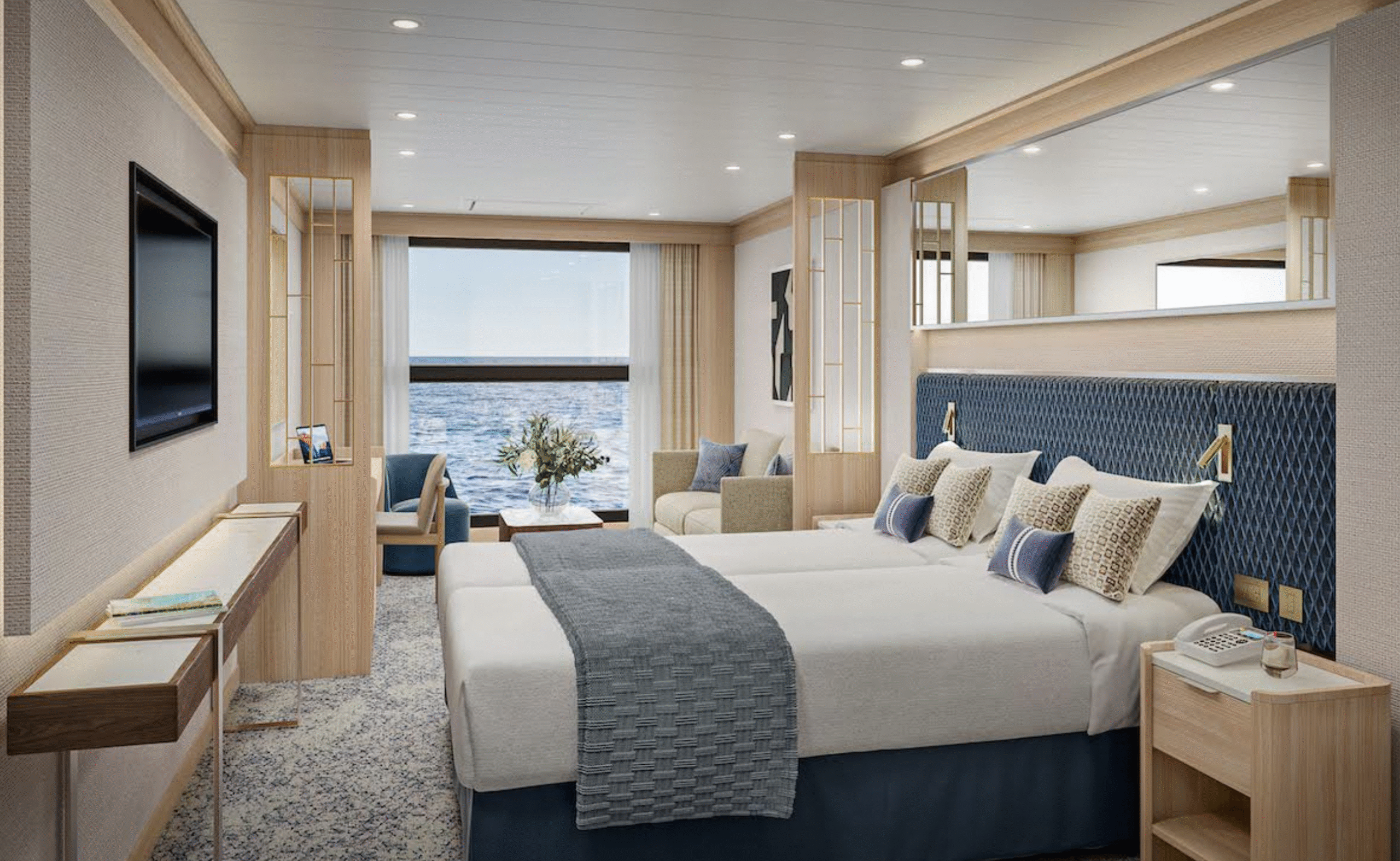 On board, the ship features 112 suites, including two Horizon Owner’s Suites with wraparound balconies. Many staterooms offer verandas or infinity windows. Guests can enjoy familiar Windstar touches such as the Yacht Club Café, a watersports platform and the line’s signature casual-luxury atmosphere.