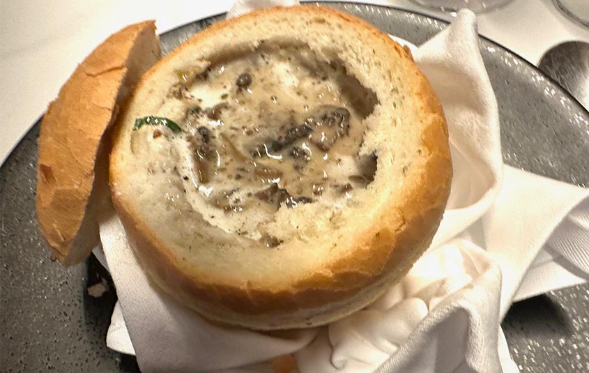 Prego, the Italian specialty restaurant on Deck 7, has been renamed and enhanced. It is now known as Osteria d’Ovidio to honour Manfredi Lefebvre d’Ovidio, former owner of Silversea Cruises and now Executive Chairman of the Abercrombie & Kent Travel Group. His Italian influence on the menu shows. Our favourite dishes included Lobster in Aqua Sale, Salt Baked Sea Bass, Tortello Pasta with braised beef and Risotto with Scampi. Missing from the menu (to the disappointment of several guests) was a Prego highlight, Mushroom Soup in a Bread Bowl. But the main restaurant, Waterside, includes it at least once per cruise.
