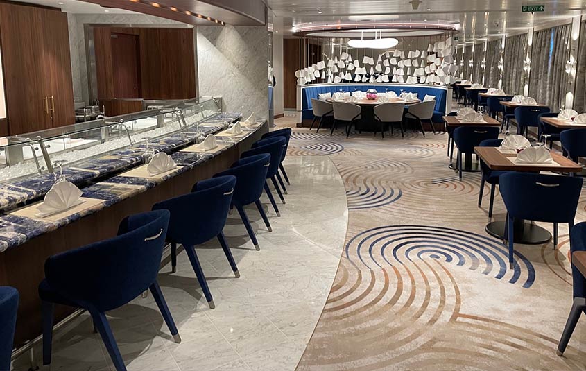 Umi Uma (Sea Horse), known as Silk Road prior to 2018, is Master Chef Nobu Matsuhisa’s only restaurant at sea. It was totally gutted and refurbished in the shipyard earlier this year and is now much brighter and more modern looking with changed colour schemes, tables and fixtures. The popular sushi bar remains and table guests can enjoy Nobu’s award-winning Japanese-Peruvian specialties like Lobster with Truffle Yuzu, Sashimi Salad and Miso Glazed Black Cod.