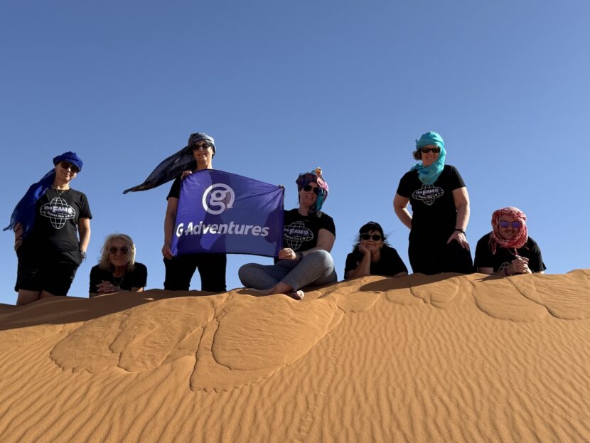 Lead image caption: G Adventures’ David Green (far right) with members of the G Adventures team fly the G flag in Morocco