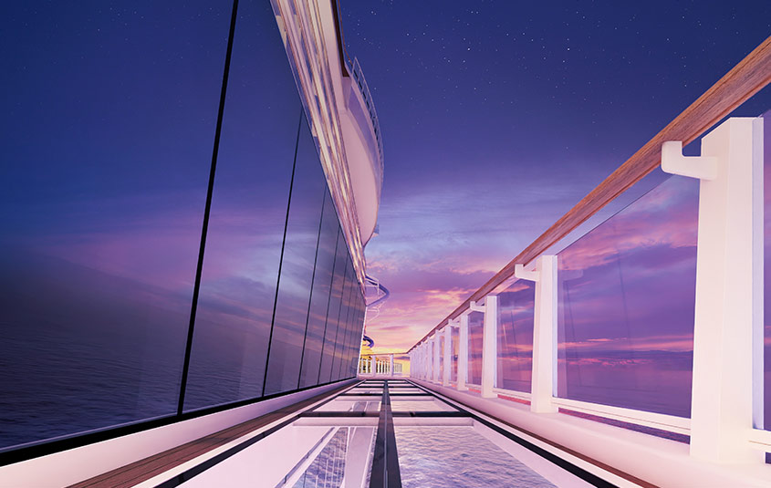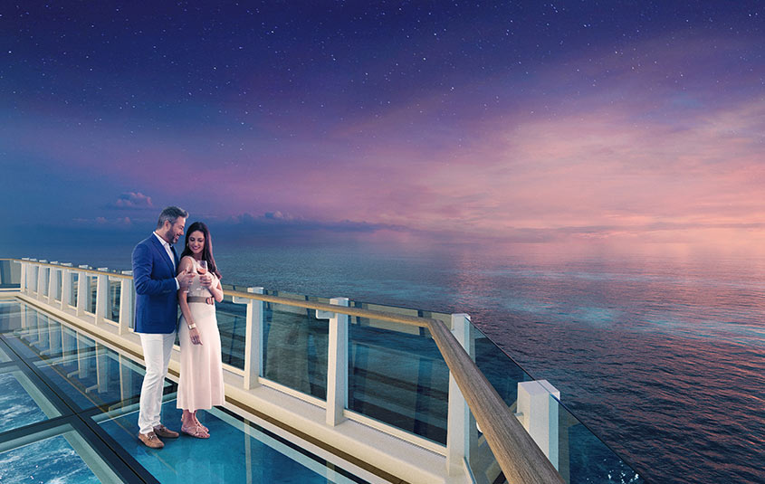 Other highlights include the Ocean Boulevard, the 44,000 square foot outdoor walkway which wraps around the entire ship; Indulge Food Hall with 11 varieties of eateries; The Concourse and its outdoor sculpture garden; expansive pool decks; infinity-style pools at Infinity Beach and Oceanwalk’s glass bridges above water.