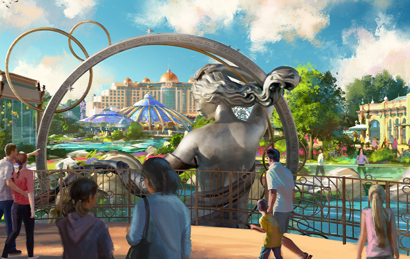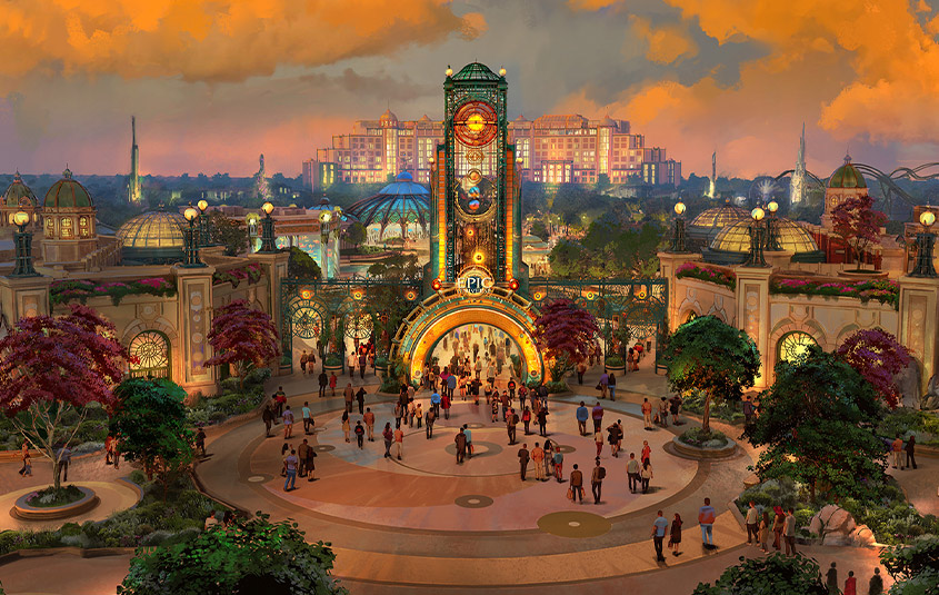 New details have emerged about Celestial Park, the heart of Universal Epic Universe and the first world guests will encounter upon arrival. With acres of rolling gardens, waterways and strolling pathways, Celestial Park will take guests through lush living gardens surrounded by stunning architecture inspired by astronomical and mythological elements. Here, they’ll be able to board a shooting comet on a roller coaster adventure, shop exclusive merchandise and dine on delicious cuisine.