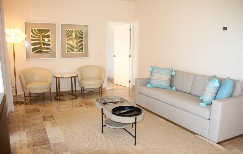 The suites in this category are very spacious: in addition to the bedrooms and bathrooms (all equipped with showers only), they feature dining area– some even have kitchenettes – and living rooms that open onto balconies. They also include Nespresso coffee machines, sound systems, and upgraded bath amenities, as well as bathrobes, slippers, beach bags, and other welcome essentials for children.