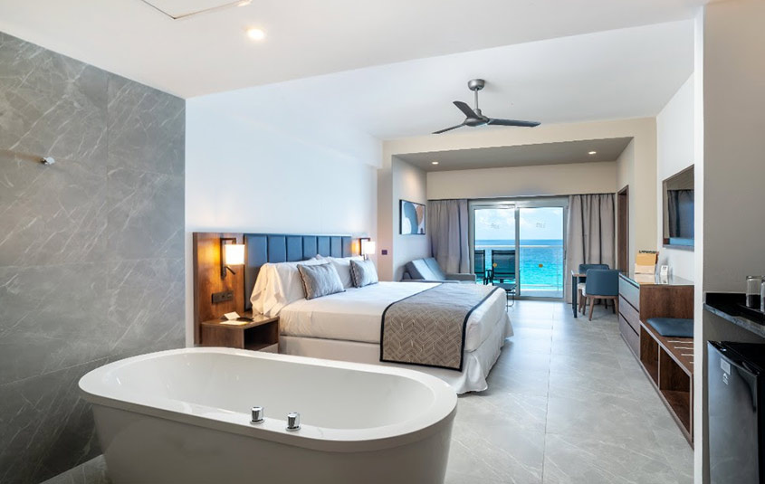 Riu notes that the rooms are bright and spacious with views of the Caribbean Sea and a colour palette dominated by natural and earth tones. Enormous green columns preside over the lobby and contrast with the comfortable curved white sofas that add distinction in combination with the spectacular lighting fixtures, says the company.