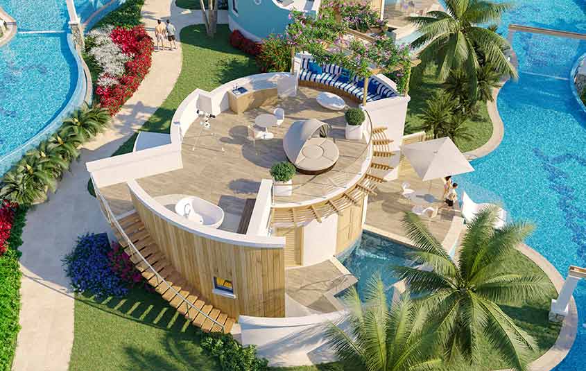 At the Coyaba Swim-Up Rondoval Butler Suites with Private Pools, Sandals’ iconic standalone villas have been reimagined with vast open-air rooftops featuring private soaking tubs, sun-lounging areas and views of the surrounding flora.