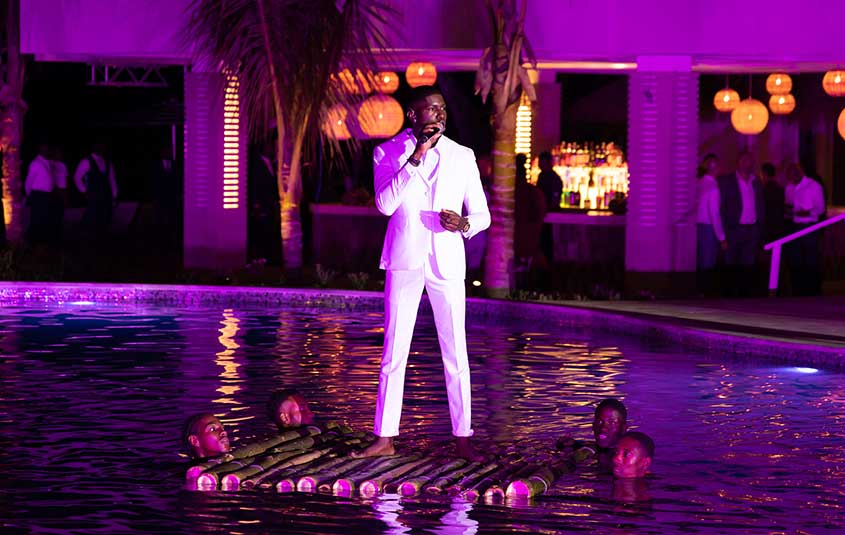 Like the resort itself, whose design inspiration is pulled from nearby Dunn’s River Falls, the event celebrate Jamaica culture from start to finish. Guests were treated to a nighttime spectacle complete with a steel-drum band, ribbon dancers, aerial performances, local musicians, a state-of-the-art video mapping of the Falls and a rousing performance from the cast of STOMP, fresh off their Broadway run. Entertainers also performed in the pool floating on original bamboo rafts custom made by Jamaican artisans. The celebration culminated with an epic performance from Shaggy and an impressive fireworks display.