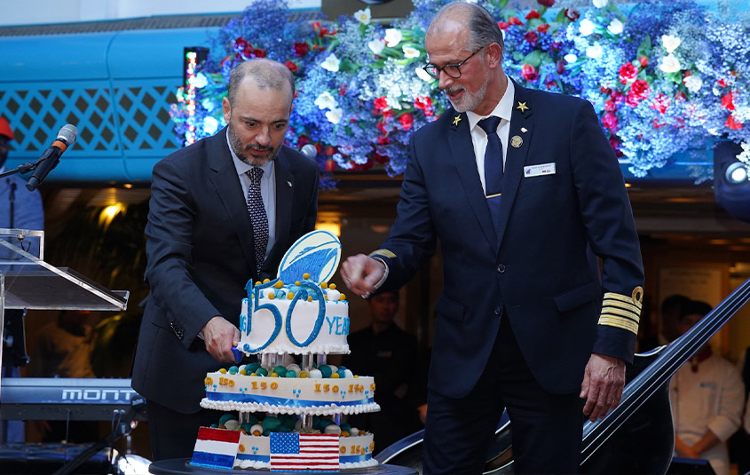 - Holland America Line President Gus Antorcha (left) keeps a steady hand as he cuts the 150th anniversary cake