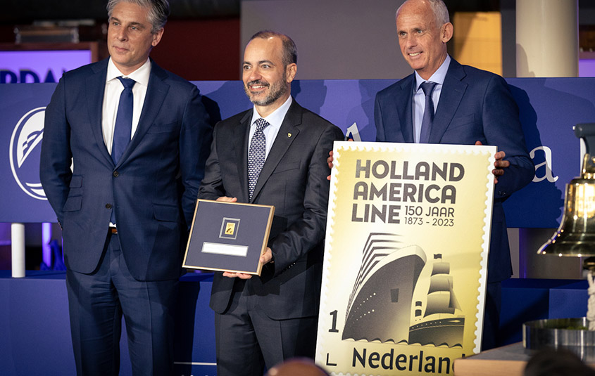- Holland America Line President Gus Antorcha (centre) celebrates PostNL’s presentation of a collectable gold-foil stamp, commemorating HAL’s 150th anniversary