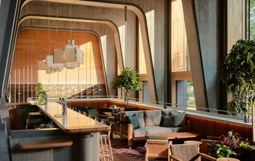 Opening the door to our guestroom, I’m first struck by colour. Front hallway walls painted in deep burgundy and rust brown, coupled with the bright amber of Douglas fir wall panelling and flooring, make for a 70s throwback that feels tasteful and current. Like the ground floor, the ceiling is concrete, and walls are minimal-ecru with just a single piece of black-and-white canvas art hanging above one of the double copper-framed beds. Custom quilts designed by Canadian artist Kyle Parent are reminiscent of those passed down from generations ago, while the honey-coloured wooden benches and desk serve as subtle nods to Canadiana and cabin culture.