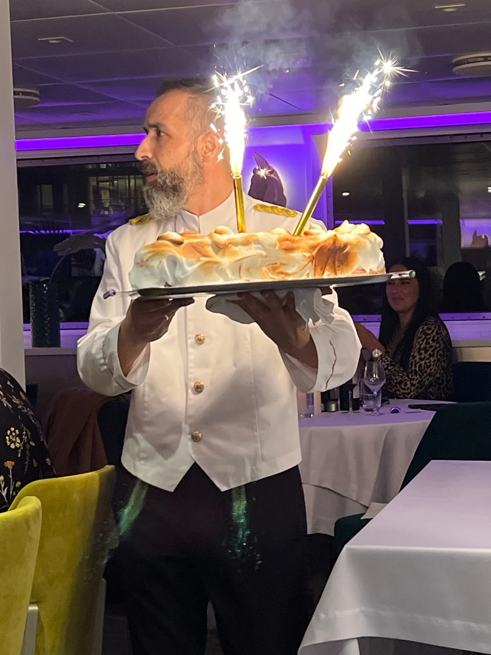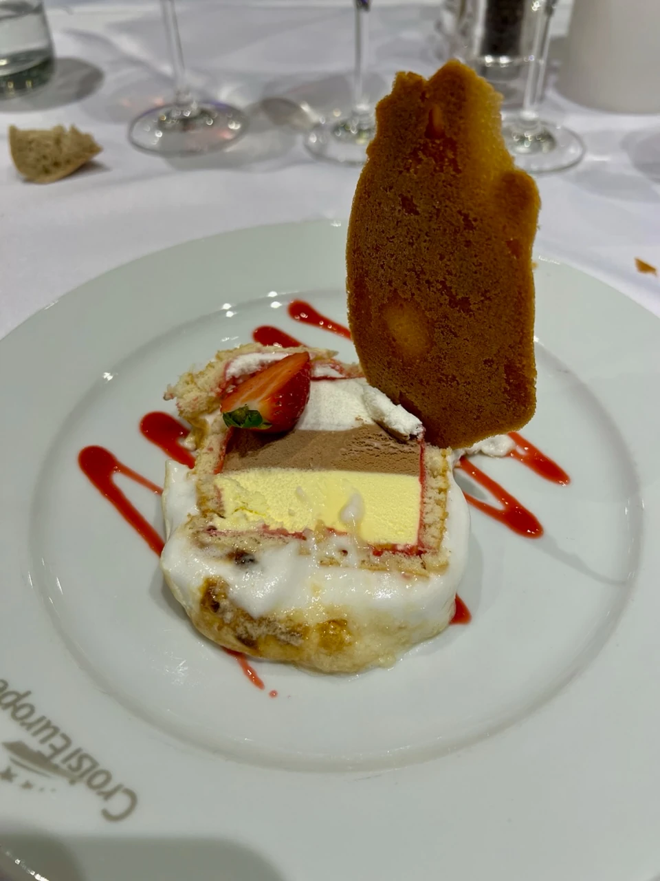 In the evening, two days before the end of the cruise, the meal ended with a Baked Alaska. This succulent dessert flambéed with Grand Marnier was served with great pomp and ceremony.