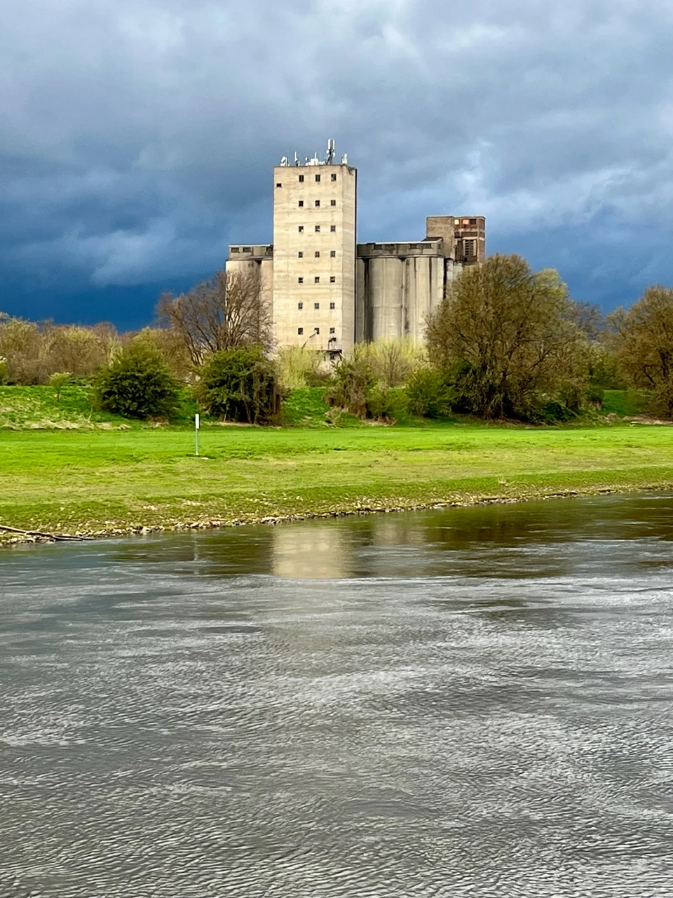 Along the water, we come across contemporary sites such as a grain silo which could be mistaken for a medieval castle, while the sky becomes threatening. Industrial installations regularly return along the route, a sign of the economic activity that prevails along the Elbe. This river has long served as the main route of communication between cities.