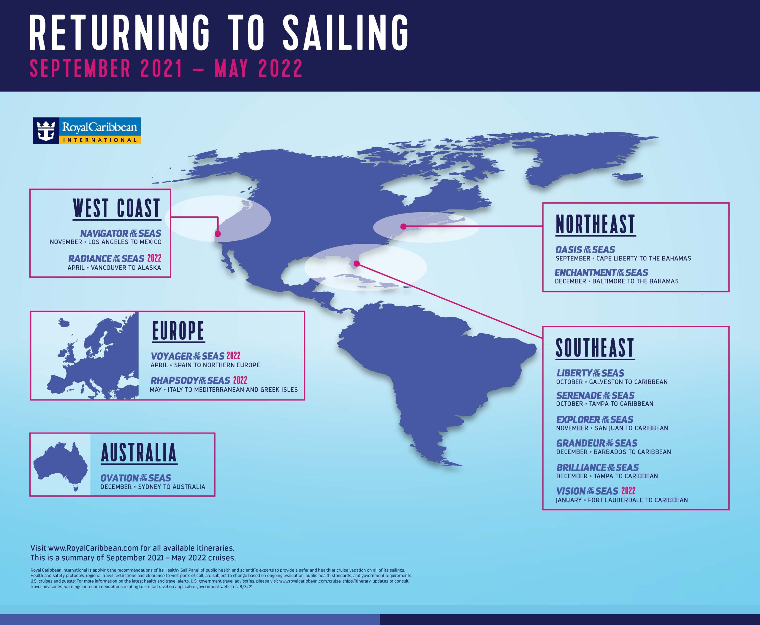 MIAMI — Royal Caribbean International will be fully back on stream by spring 2022 with a complete lineup of ships that will span the globe.