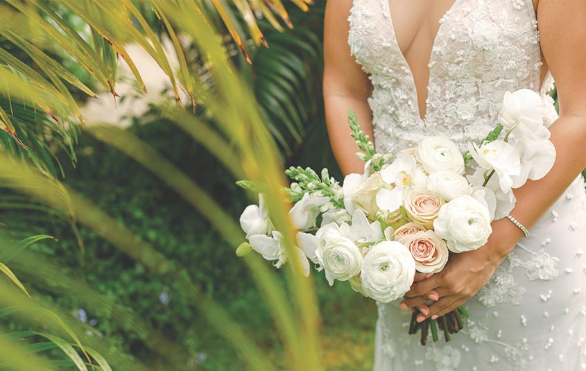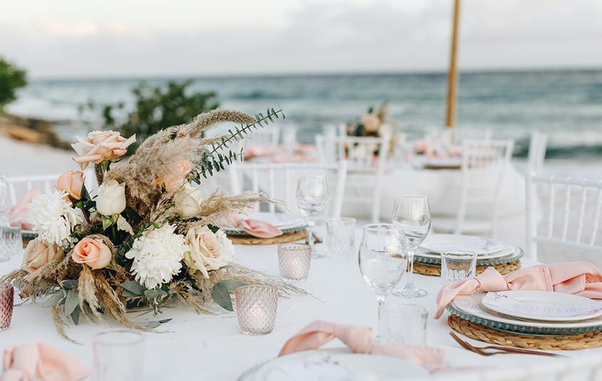 - Sunkissed Skies: This style reflects the Caribbean’s iconic sunsets with a palette of soft pink, deep blush and ivory with gold accents