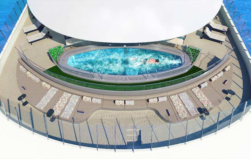 Scenic Eclipse II’s reimagined Sky Deck boasts 270-degree views and a new Sky Bar with indoor and outdoor seating. A large, oval-shaped Vitality Pool on the Sky Deck comes in at 29 ft. by 11.5 ft.