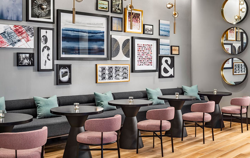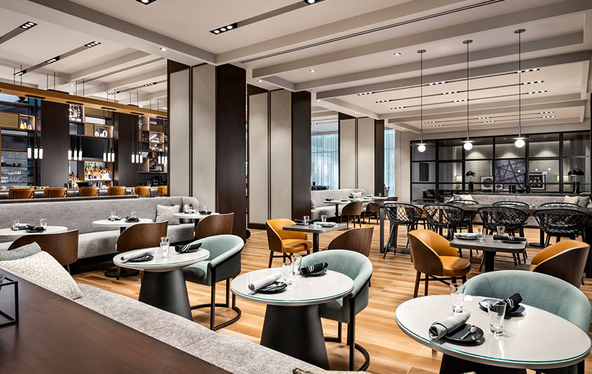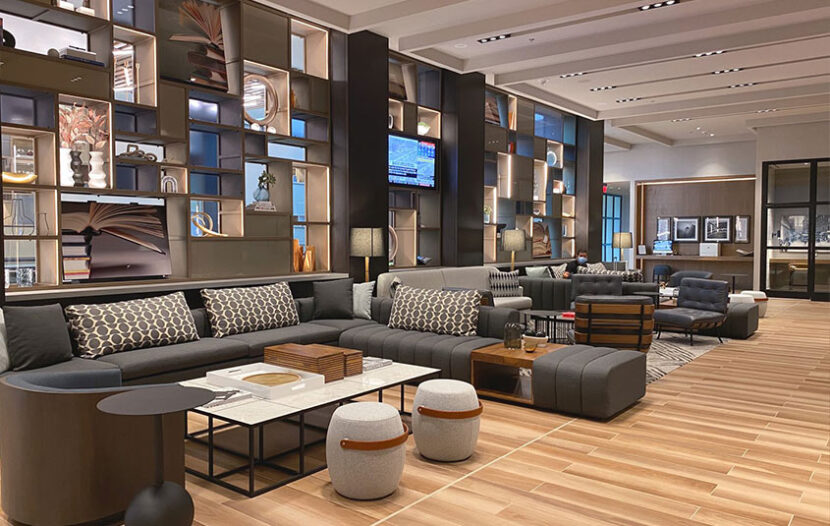 The Sheraton Gateway’s lobby has been re-imagined as a holistic, wide open space, well-lit lobby and with high ceilings and ample room for social distancing.