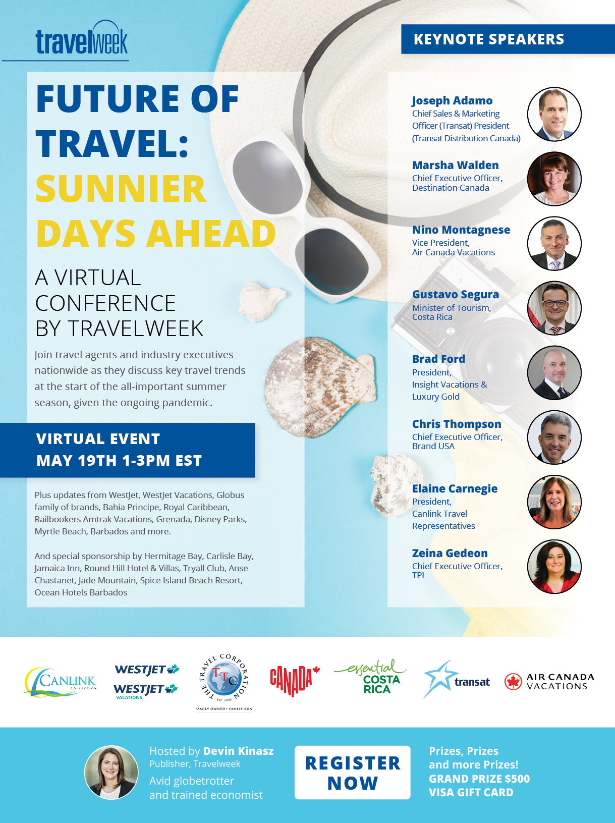 ‘Future of Travel: Sunnier Days Ahead’ will take place Wed. May 19, from 1 – 3 p.m. It’s the fourth instalment in Travelweek’s Future of Travel series of virtual conferences and, as always, it includes a stellar lineup of travel industry execs, updates from key suppliers, prize opportunities and more.