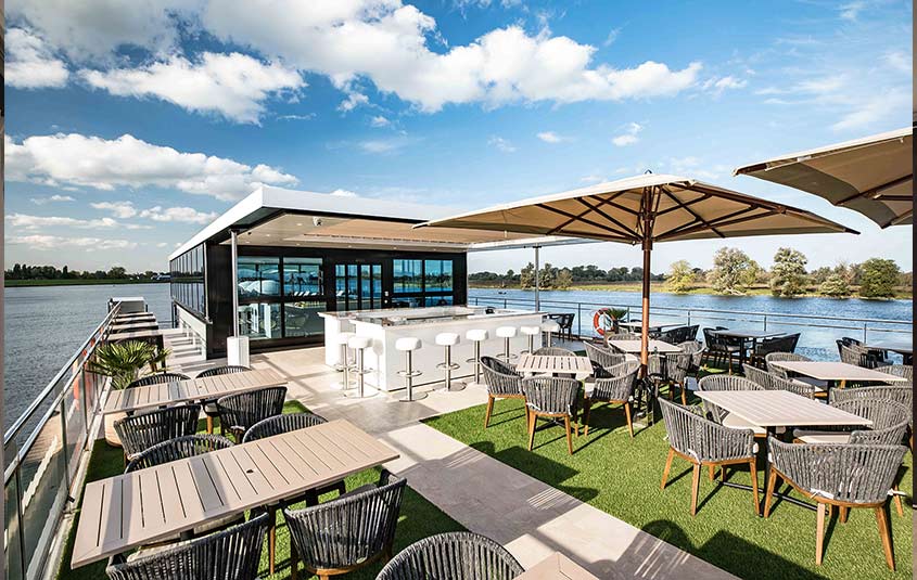 The ship’s Sun Deck has been designed and outfitted to serve as an ideal platform for viewing the Douro valley’s passing landscapes. It features canopied Balinese day beds, an outdoor grill, full-service bar plus an infinity-style pool that’s five-times the size of plunge pools featured on Tauck’s other riverboats. The most notable feature on the Sun Deck, however, is a pop-up restaurant that rises from the stern of the ship on hydraulic lifts to become a fully functioning eatery. Named Arthur’s for Tauck chairman Arthur Tauck Jr., the restaurant offers a mix of steakhouse-style classics and regional fare.