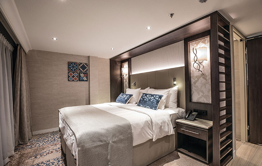 The Andorinha accommodates just 84 guests versus up to 112 passengers (or 33% more people) on other cruise lines’ Douro ships of the same size. Guests are accommodated in 42 cabins, including 12 300-square-foot suites on the upper Diamond Deck and 20 225-square-foot staterooms primarily on the Ruby or mid-level deck. The remaining accommodations (six 200-square-foot cabins and four 150-square-foot cabins) are on the lower or Emerald Deck.