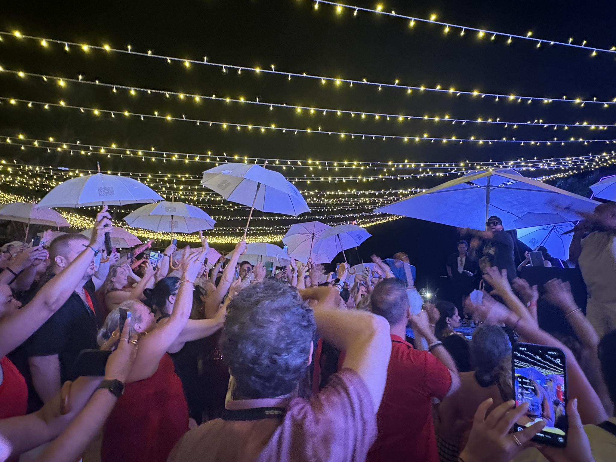 Under a sea of umbrellas, guests enjoyed several live performances before the night ended with a spectacular fireworks display.