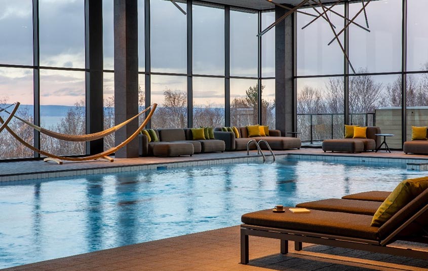Wellness offerings include a full-service spa, 23-metre heated pool, outdoor jacuzzi, hammam and more.